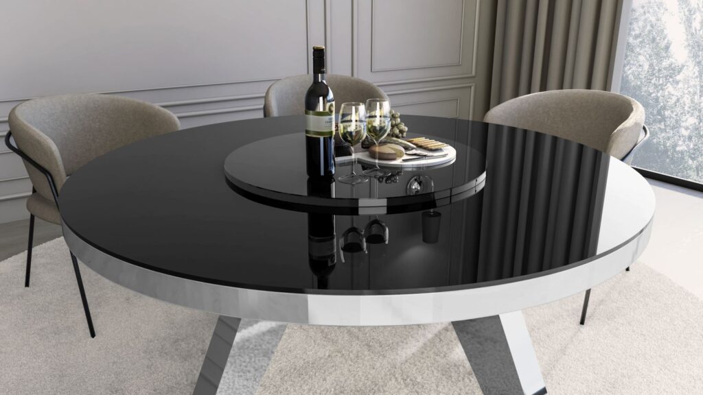Ponadto, niektóre stoły będą wyposażone w dodatkowy, zamontowany na środku, okrągły blat obrotowy, dający możliwość łatwego dostępu do serwowanych potraw z każdej strony.