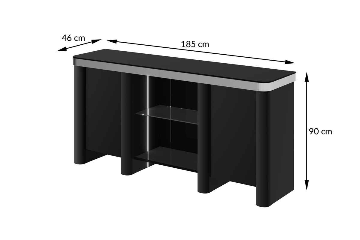 Model oferuje praktyczną przestrzeń do przechowywania, dzięki czemu doskonale sprawdzi się w salonie, jadalni lub eleganckim holu. Zestawienie kolorów (biel, czerń lub kaszmir) z lśniącymi detalami pozwala tworzyć aranżacje w duchu luksusowej nowoczesności.