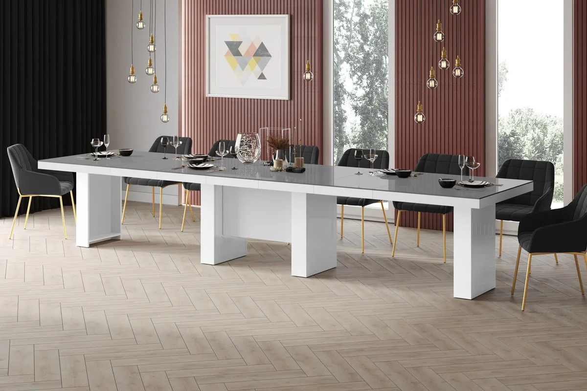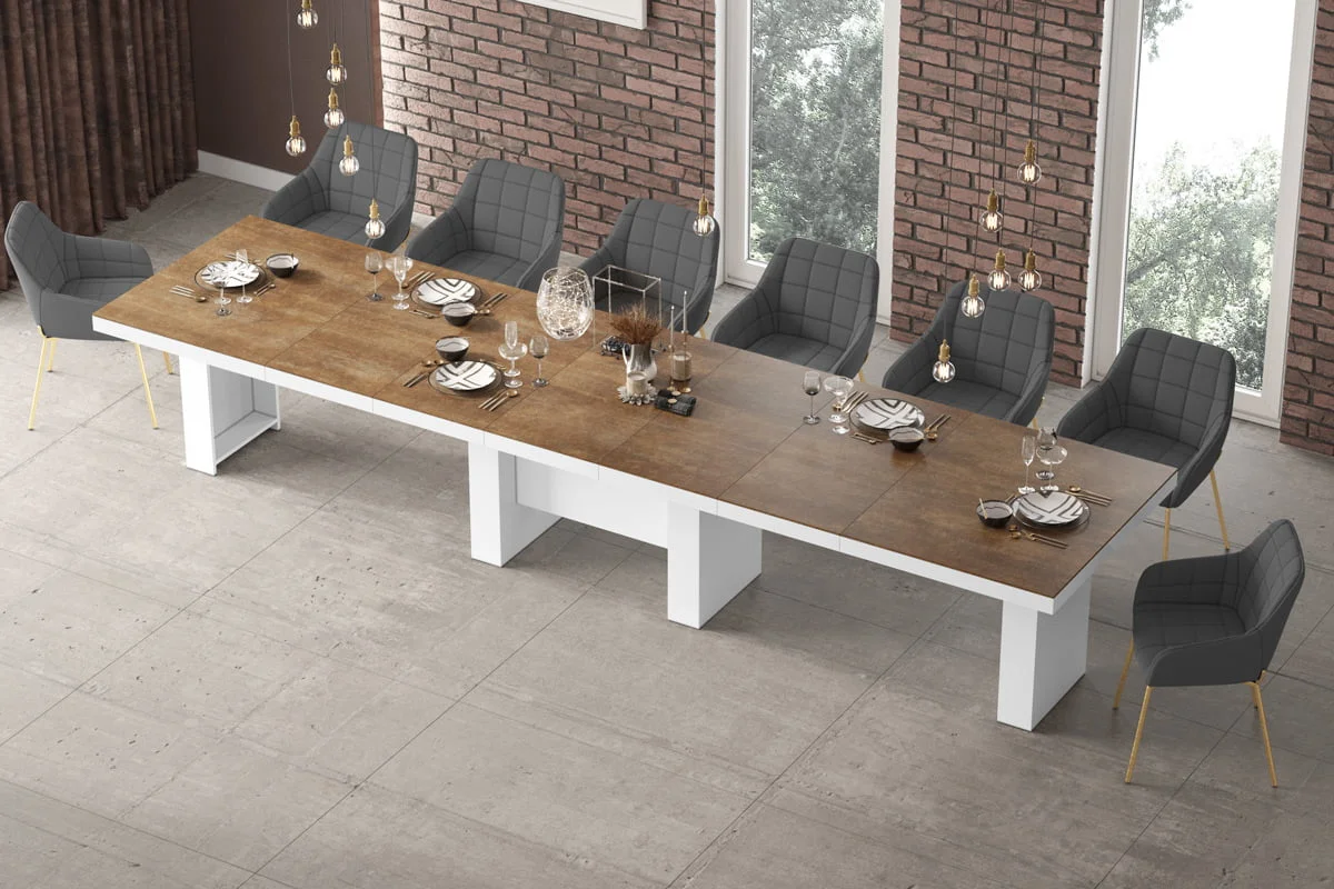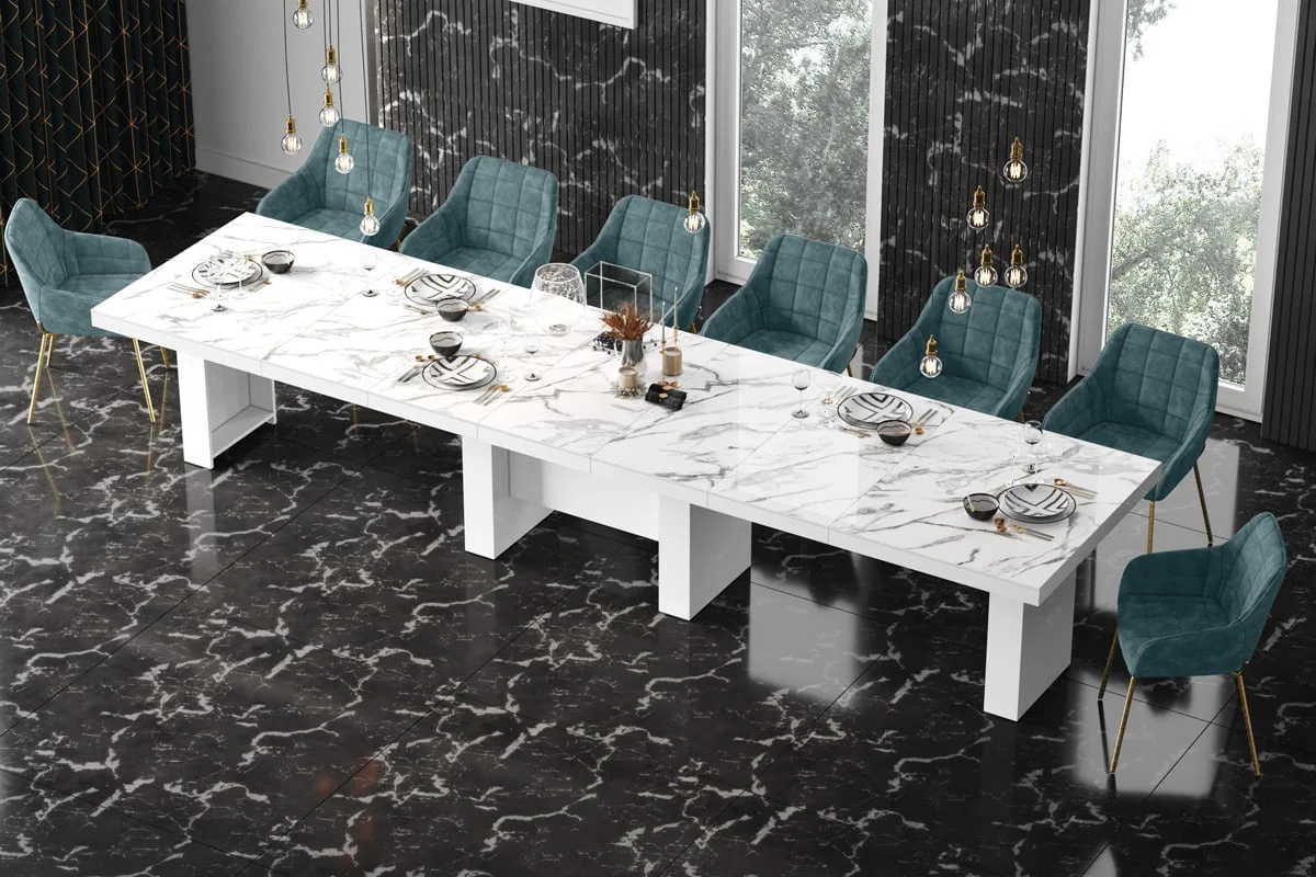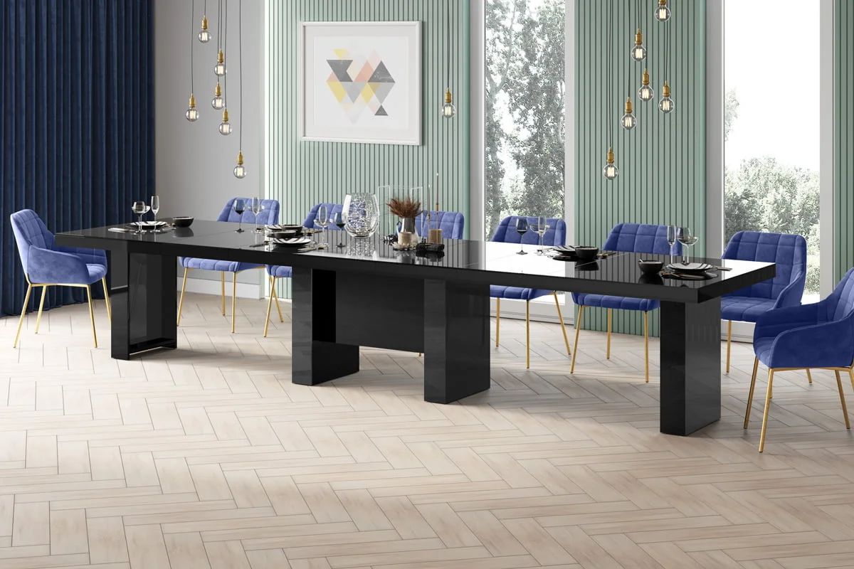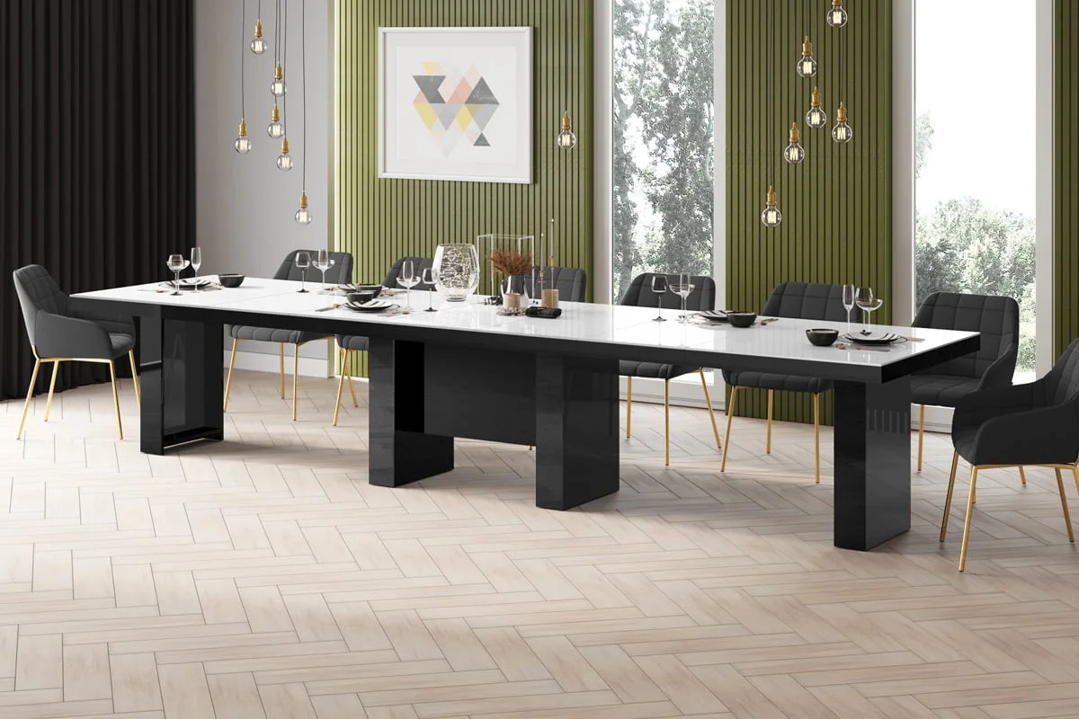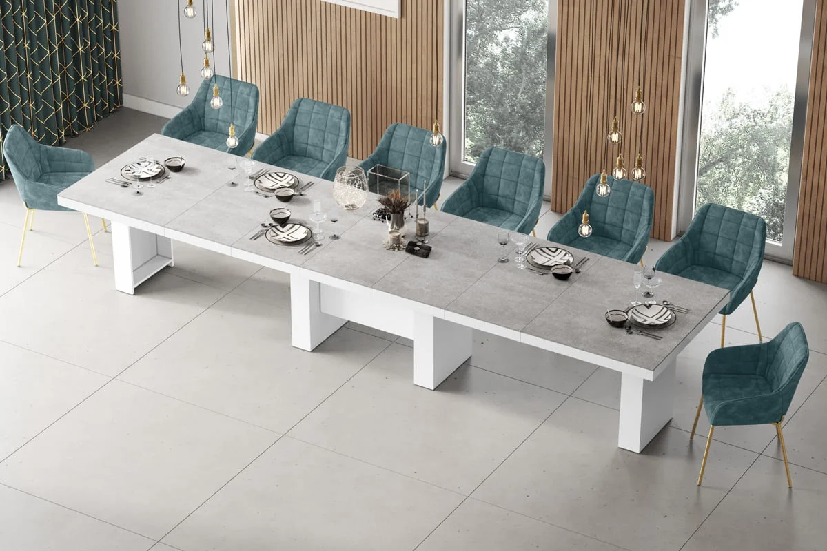 model rozkładany od 160 cm do 400 cmStół LARGO został zaprojektowany jako jeden z największych dostępnych na rynku stołów. Rozkłada się od 160 cm do maksymalnie 400 Cm i z łatwością pomieści nawet do 20 osób. Blat główny opiera się na szerokiej, nowoczesnej, minimalistycznej w design kolumnie, która w środku wyposażona jest w schowek na dodatkowe blaty powiększające. Konstrukcja kolumny (jej usytuowanie 22 cm nad podłogą) to zabieg celowy zapewniający większy komfort i swobodę usytuowania nóg osobom siedzącym przy stole. Wpasowując się w nowoczesne trendy, a także dla zachowania odpowiednich proporcji stołu, blat został pogrubiony.