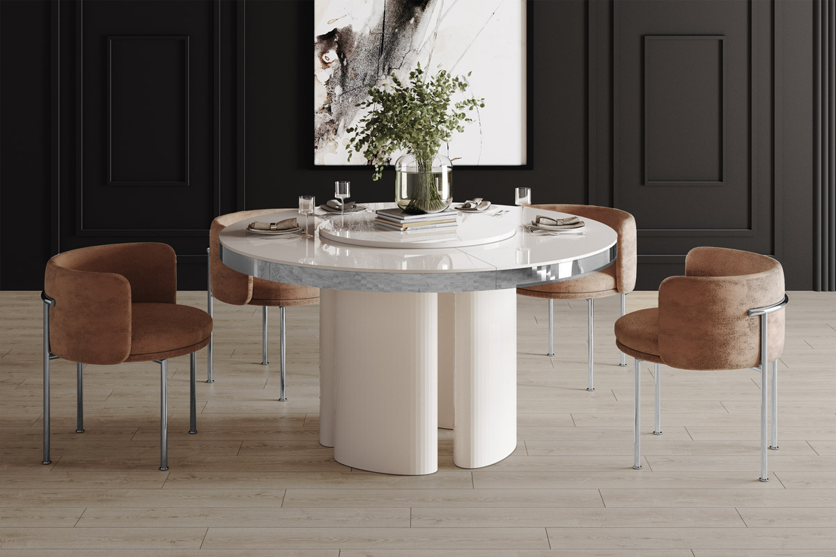Stół MIRACOLO GLAM jest innowacyjnym połączeniem nowoczesnej formy i praktycznych rozwiązań. Okrągły blat stołu z efektowną lustrzaną krawędzią został osadzony na czterech nogach w kształcie walców eliptycznych. Ich kształt oraz delikatnie prążkowana powierzchnia podnoszą estetykę całego modelu.