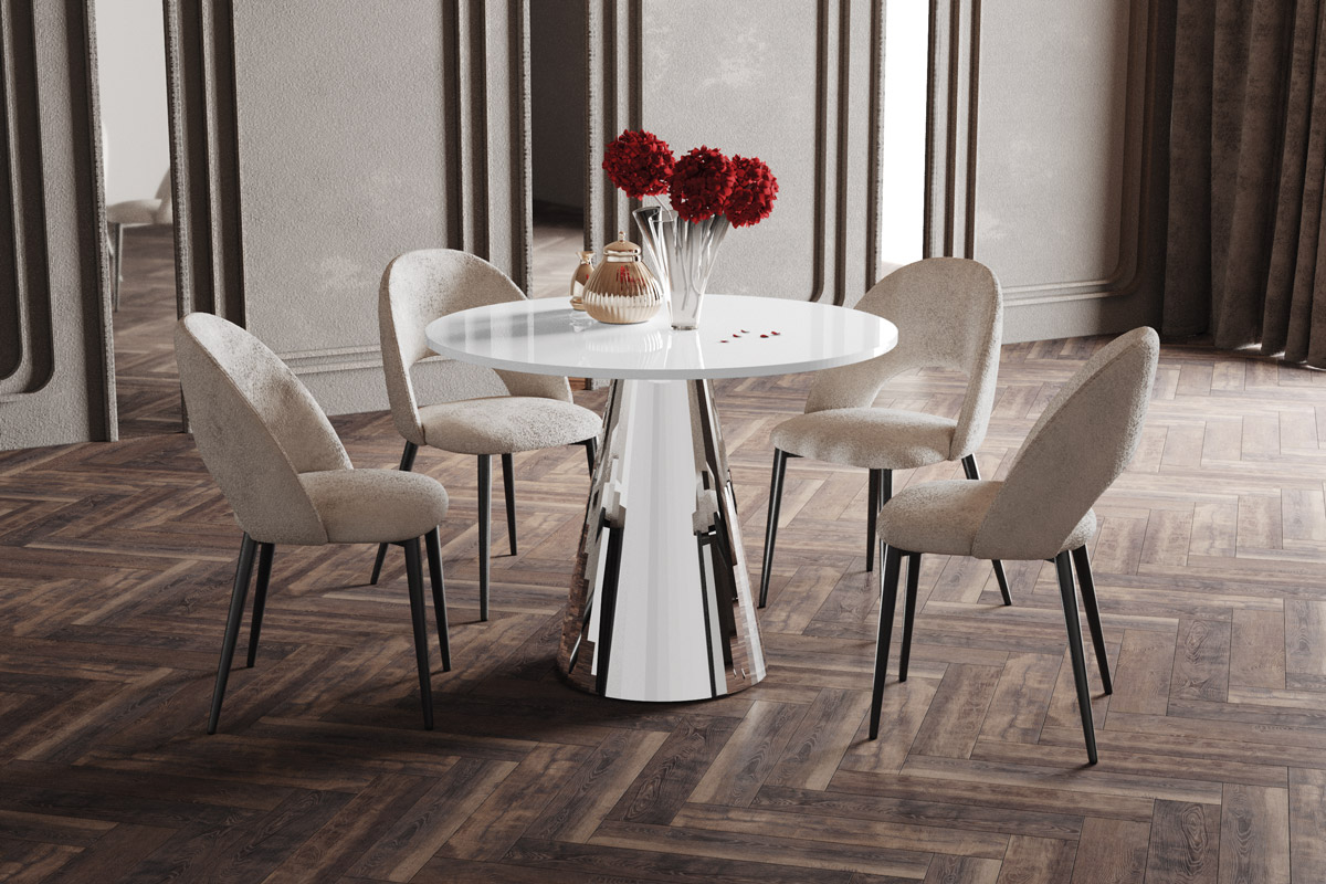 kolekcja GLAMOURStół PINETO GLAM przyciąga uwagę swoją oryginalną formą. Okrągły blat został osadzony na stożkowej, nietypowo zaoblonej nodze z charakterystyczną strukturą delikatnych prążków na lustrzanej powierzchni.