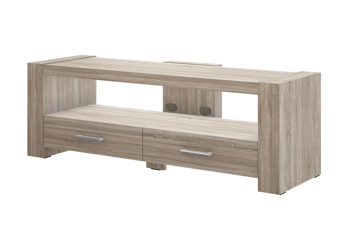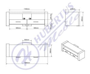 Blat stolika ma wymiary 1170 x 450 mm, pod blatem zanjduje się półka przeznaczona na sprzęt audio-video o wymiarach 1170 x 430 mm, odległość pomiędzy półką a blatem wynosi 195 mm, max obciążenie półki 20 kg/szt. Pod półką znajdują się dwie szuflady w których możemy przechowywać np. płyty DVD, kable itp. W szufladach zastosowane są najwyższej klasy prowadnice kulowe z systemem samodomykania oraz chromowane uchwyty.
